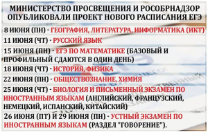 Срок начала основного периода единого государстувенного экзамена (ЕГЭ) 2020 года будет перенесен на 8 июня, основного государственного экзамена (ОГЭ) для выпускников 9 классов – на 9 июня.