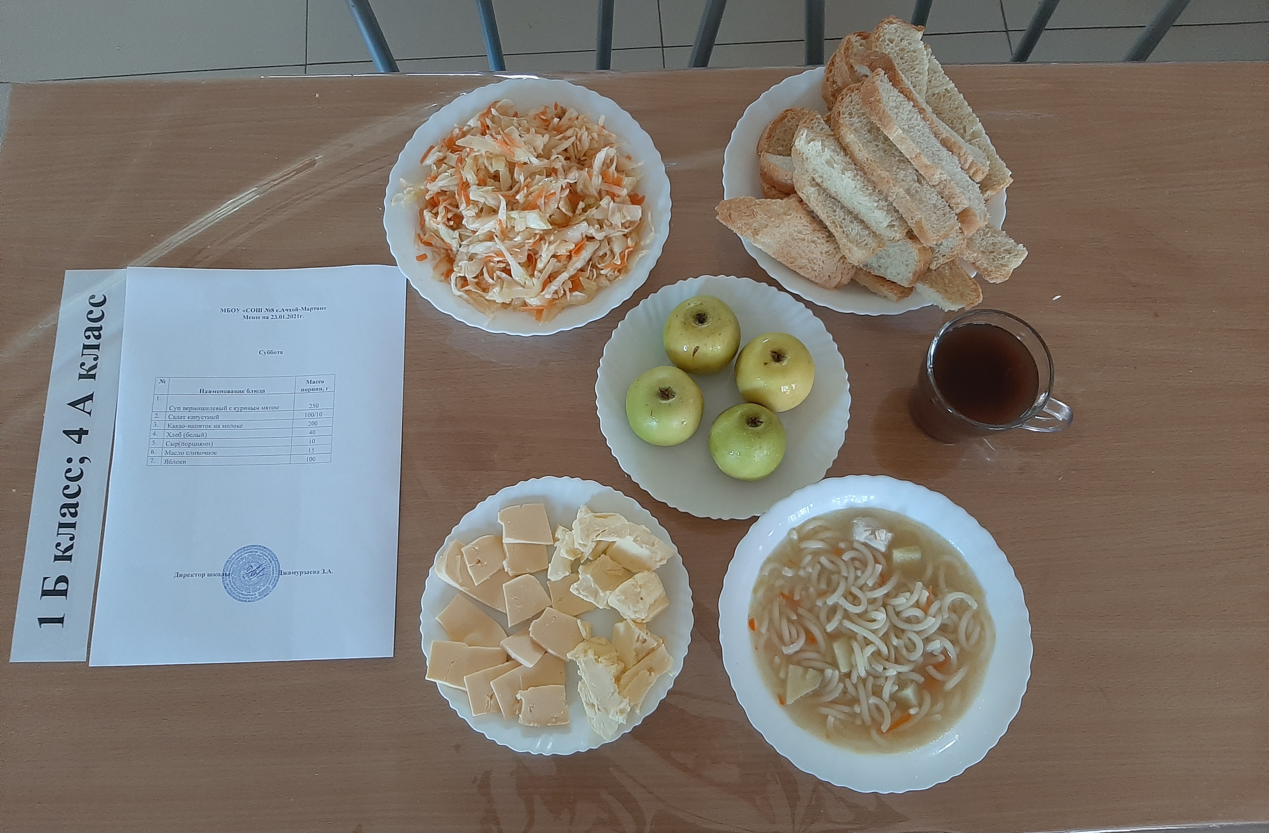 Меню в столовой на субботу: 1. Суп вермишелевый с куриным мясом; 2. Салат капустный; 3. Какао напиток на молоке; 4. Хлеб; 5. Сыр; 6. Масло сливочное; 7. Яблоки.