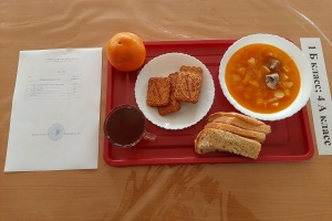 Меню горячего питания на пятницу: 1. Борщ с мясом, капустой и картошкой; 2. Хлеб; 3. Чай с сахаром; 4. Печенье; 5. Апельсин.