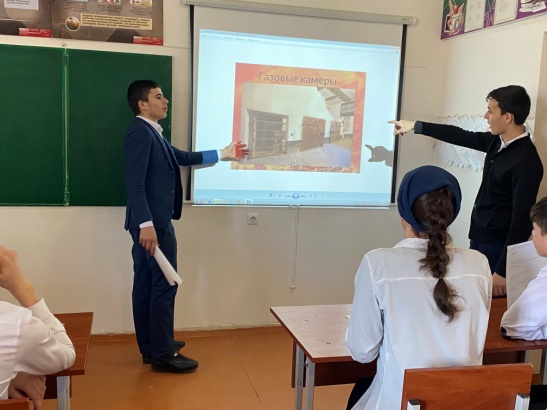 Урок начался видеофрагментом «Реквием» В.А.Моцарта, учитель рассказала об истории и жертвах Холокоста, приведшего к истреблению одной трети еврейского народа. Рассказ учителя сопровождался чтением учащихся стихов о трагедии Холокоста.