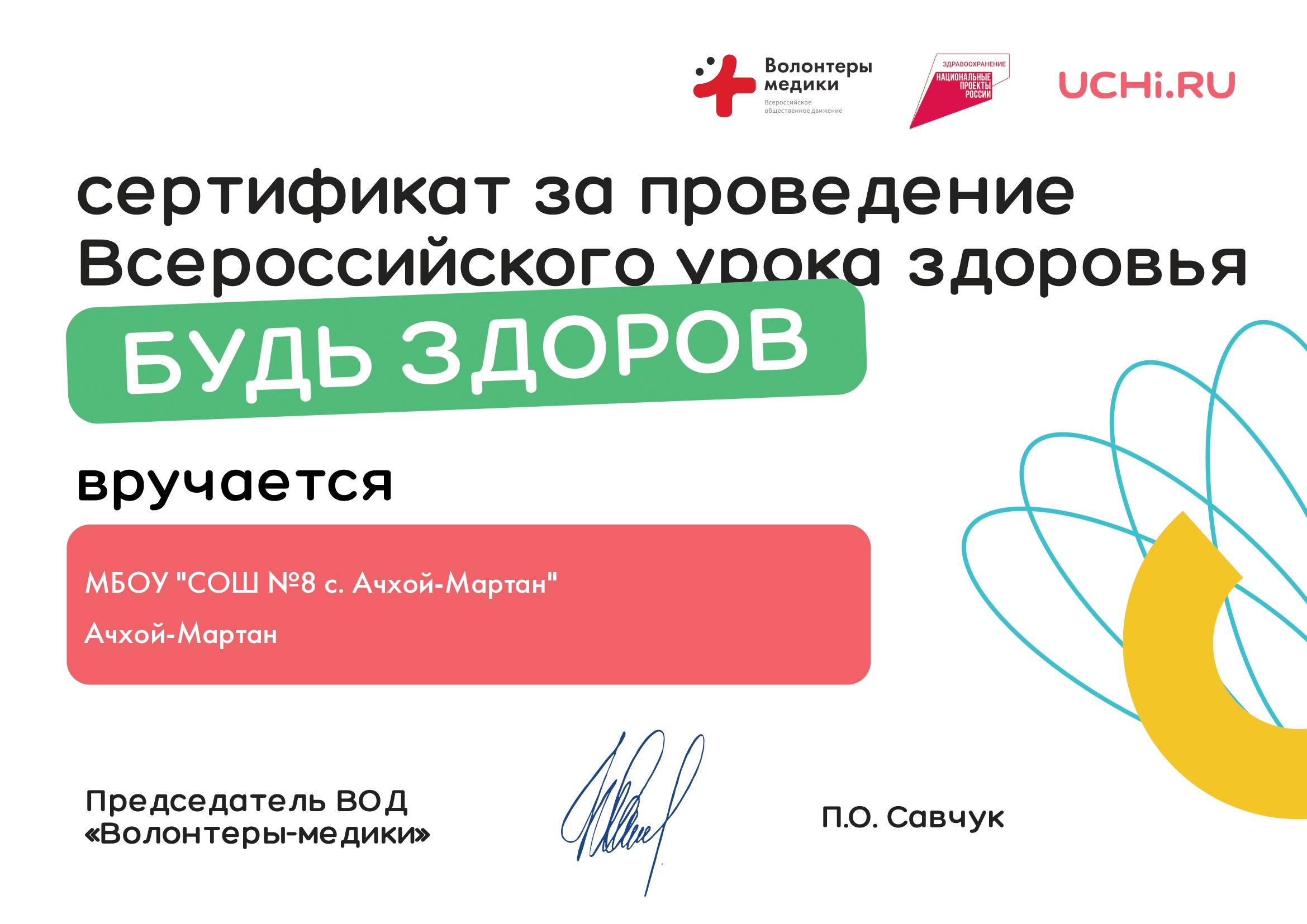В рамках участия во Всероссийской акции "Будь здоров!", приуроченной ко Всемирному дню здоровья был проведен Всероссийский урок здоровья, направленный на популяризацию здорового образа жизни среди подрастающего поколения и формирование представлений об основных компонентах здорового образа жизни.