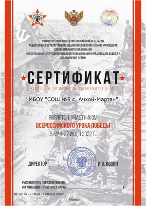 Обучащиеся МБОУ "СОШ №8 с. Ачхой-Мартан" приняли участие во Всероссийском уроке Победы и получили сертификат об участии.