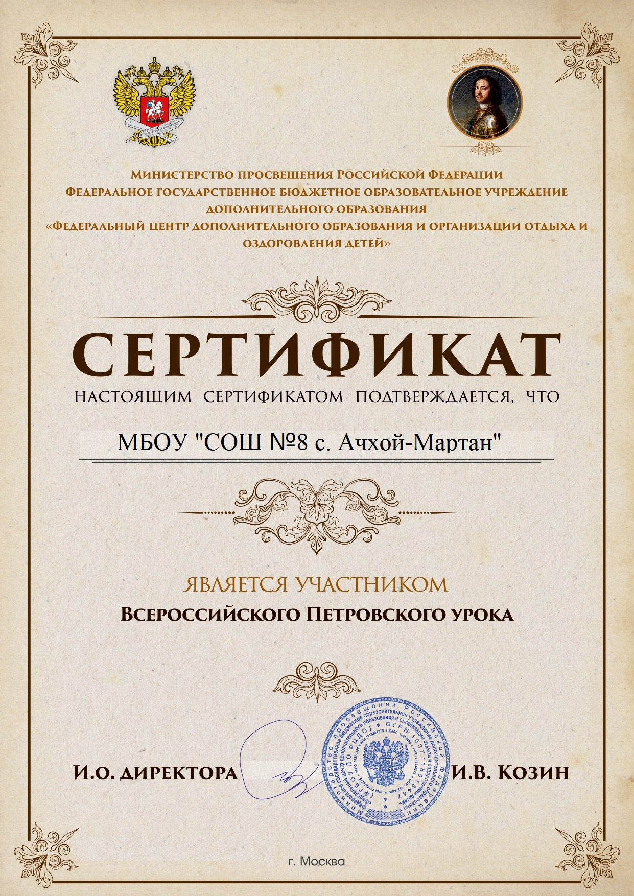 29.09.2022Обучающиеся МБОУ "СОШ №8 с. Ачхой-Мартан" приняли участие во Всероссийском Петровском уроке, который проводится Министерством просвещения РФ и ФГБОУ ДО «Федеральный детский центр дополнительного образования и организации отдыха и оздоровления детей» и получили сертификат участника урока.