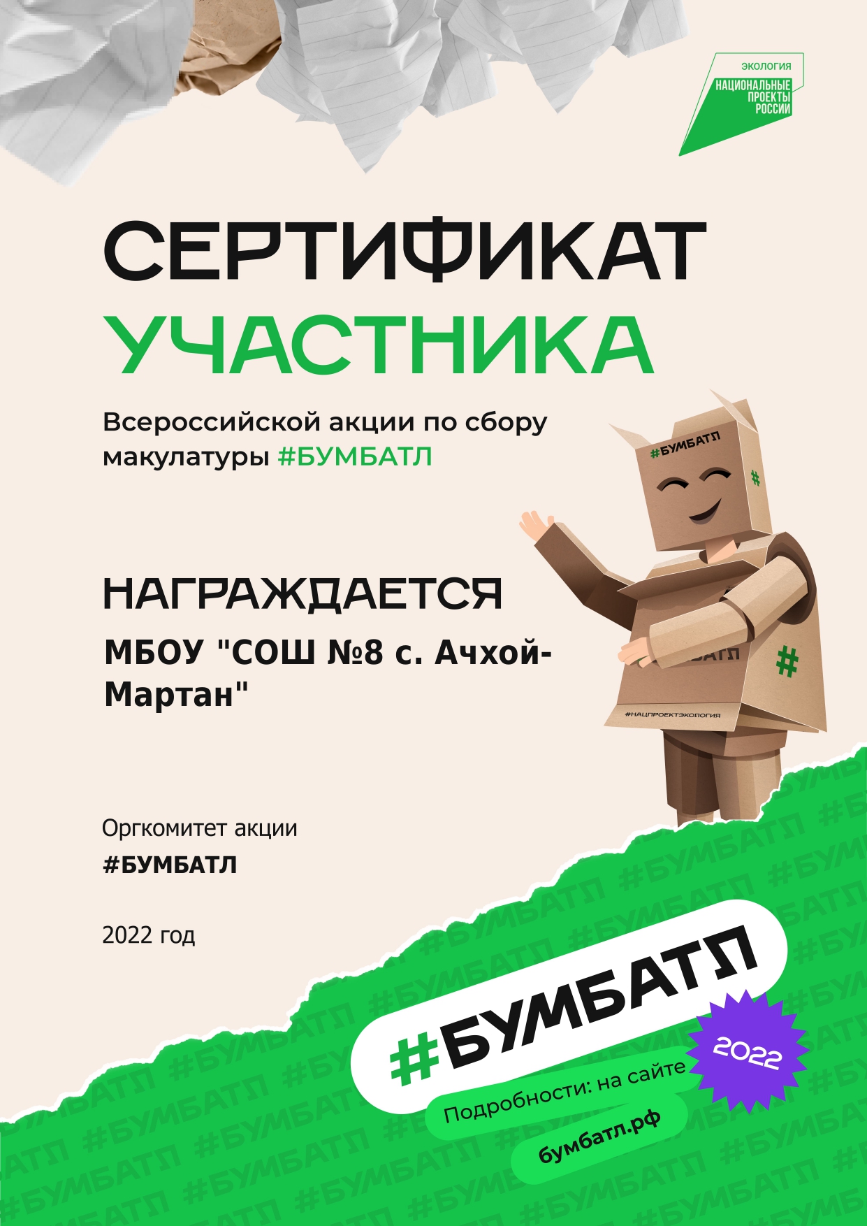 Также обучающиеся приняли активное участие по сбору макулатуры и получили сертификат об участии. Общая масса собранной макулатуры составила 30 кг.