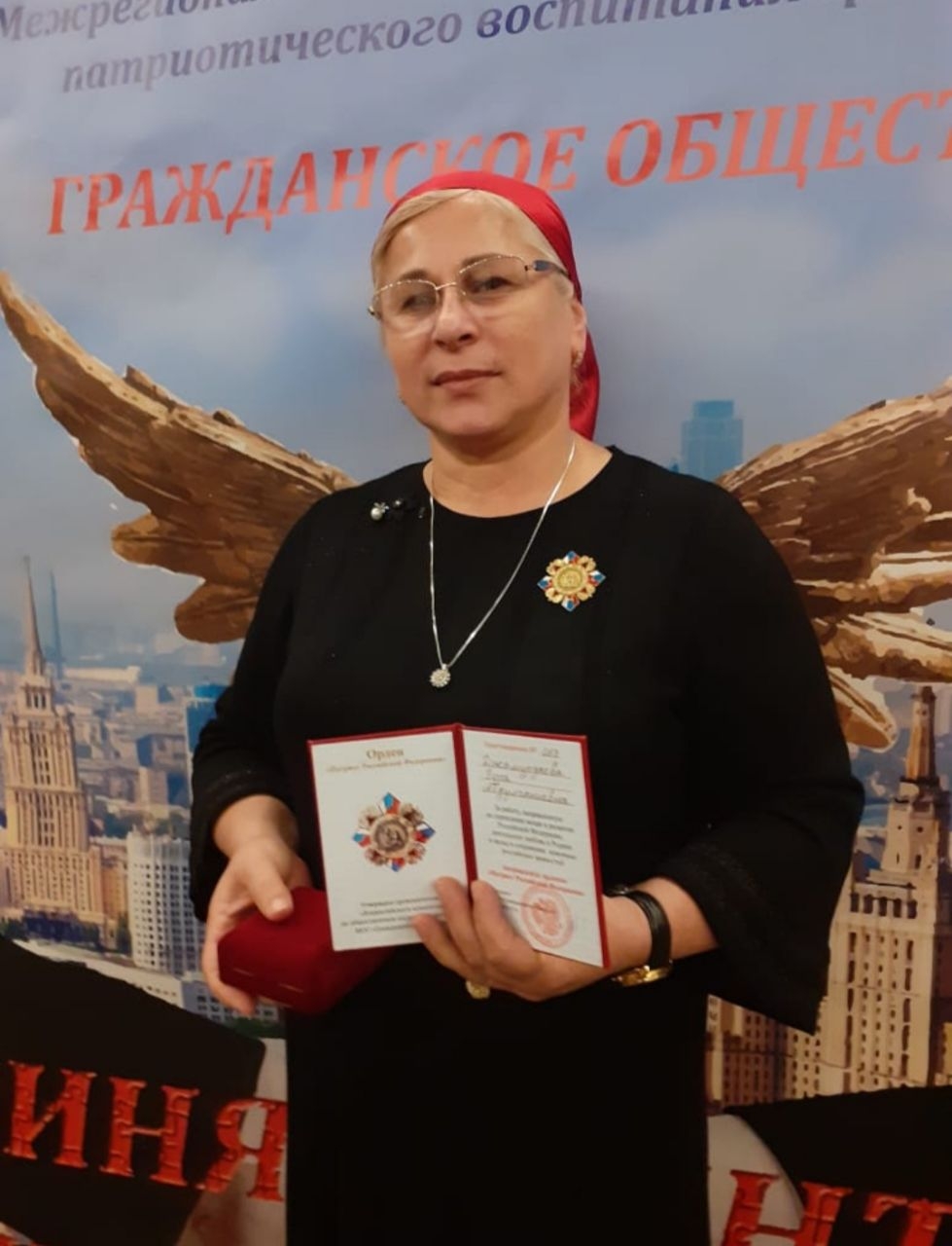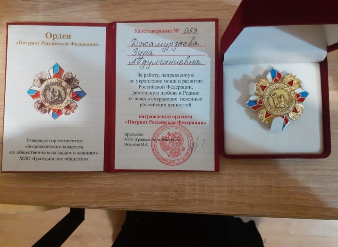 Накануне в «Президент-отеле» города Москвы состоялось мероприятие, в ходе которого чествовали представителей различных сфер за достижения в осуществляемой деятельности. За работу, направленную на укрепление мощи и развитие РФ, деятельную любовь к Родине и вклад в сохранение исконных российских ценностей сертификат и орден получила и директор СОШ №8 села Ачхой-Мартан Зура Джамурзаева. Награду ей передал президент межрегиональной общественной организации патриотического воспитания граждан «Гражданское общество» И.А. Новиков. Поздравляем Зуру Абдулганиевну с этим успехом и желам ей удачи в дальнейшей работе!