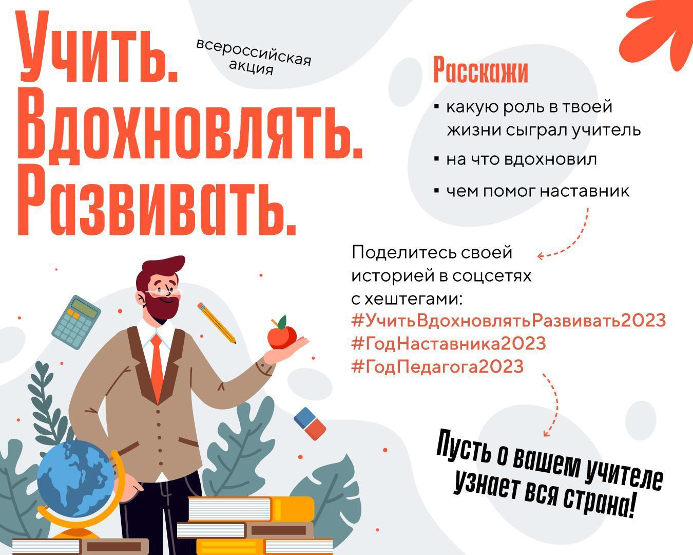 Чтобы принять участие в акции, нужно на личной странице в социальной сети «ВКонтакте» разместить свой текст, фото или видеоролик по темам: «Наставник/Педагог – это…»; «Благодаря наставнику/педагогу я добился...»; «Как я стал наставником/педагогом». В конце поста следует поставить хештеги #УчитьВдохновлятьРазвивать2023, #ГодНаставника2023 и #ГодПедагога2023.