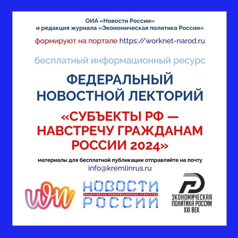 Руководствуясь задачами информирования широких кругов общественности и федеральных органов государственной власти в деле обеспечения регионами России полного исполнения социальных обязательств перед населением, снижения бедности и неравенства, роста благосостояния и качества жизни граждан на основании базовых, интегральных ориентиров развития страны до 2030 года, обозначенных Президентом РФ В.В.Путиным на Заседании Совета по стратегическому развитию и национальным проектам 15 декабря 2022 года, ОИА «Новости России» и редакция журнала «Экономическая политика России» формируют на портале https://worknet-narod.ru/ Федеральный новостной лекторий «Субъекты РФ — навстречу гражданам России 2024» https://worknet-narod.ru/subekty-rf-navstrechu-grazhdanam-rossii-2024-federalnyj-novostnoj-lektorij/