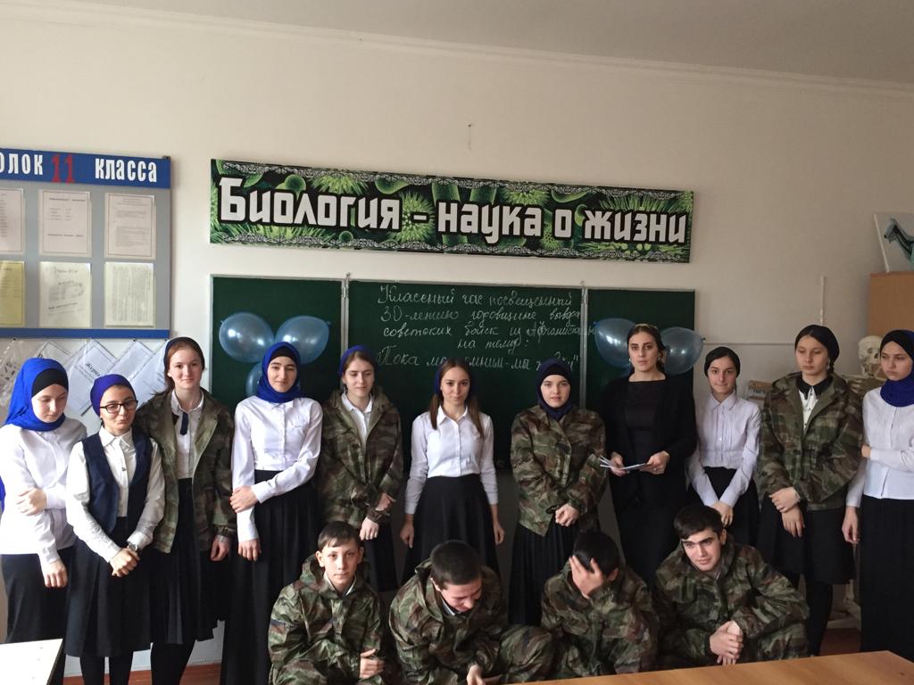15.02.2019В целях воспитания гражданственности и патриотизма, чувства долга, познавательного интереса к историческому прошлому своего народа в 7-11 классах были проведены классные часы на тему: «Пока мы помним – мы живем» в 10 кл. учитель Сатуева М.А. , «Афганистан – незаживающая рана» в 8 кл.учитель Удаева Э.З., «Афганистан - наша память и боль» в 7 кл.учитель Масаева Ф.С-Э.